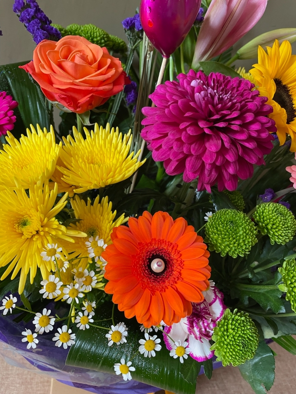 This very large bouquet, complemented by lush greenery and playful fillers, bursts with colour and energy, making it a dazzling and joyful centrepiece perfect for any celebration.