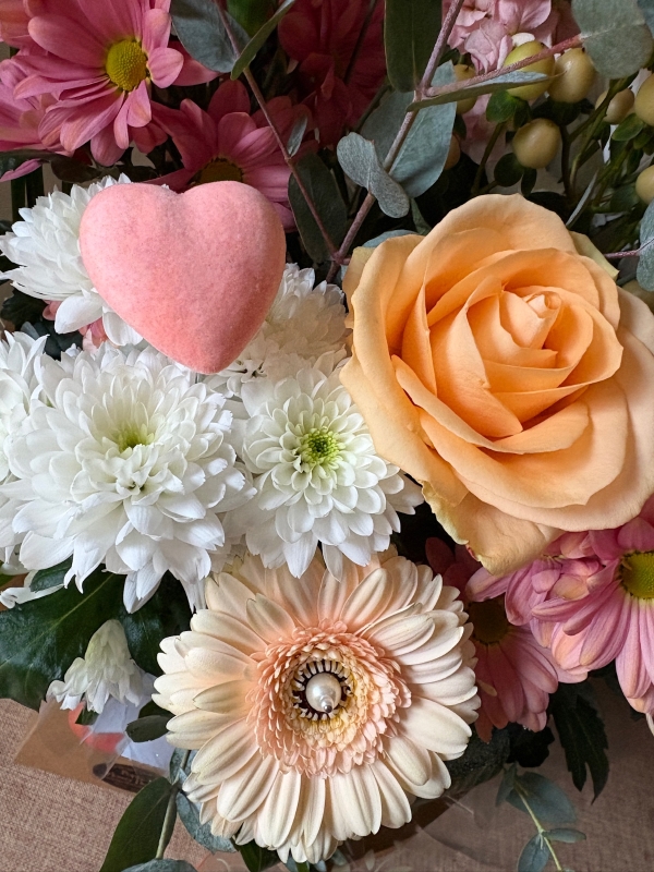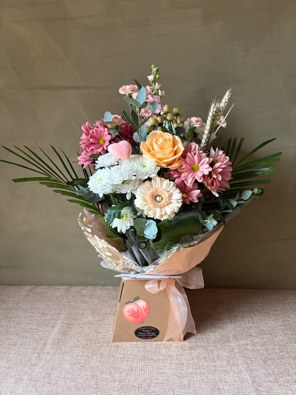 A gorgeous mix of soft peach, blush pink and creamy white blooms creates a fresh, joyful arrangement that’s light-hearted and full of personality.