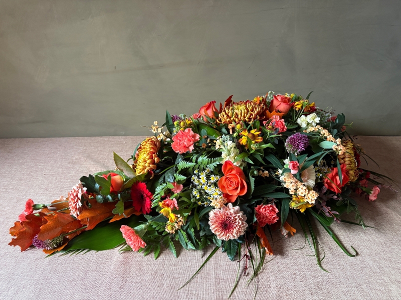 A warm and rustic single-ended spray, thoughtfully arranged with rich seasonal tones and natural textures. This elegant tribute captures a sense of comfort and sincerity, creating a timeless expression of remembrance.
