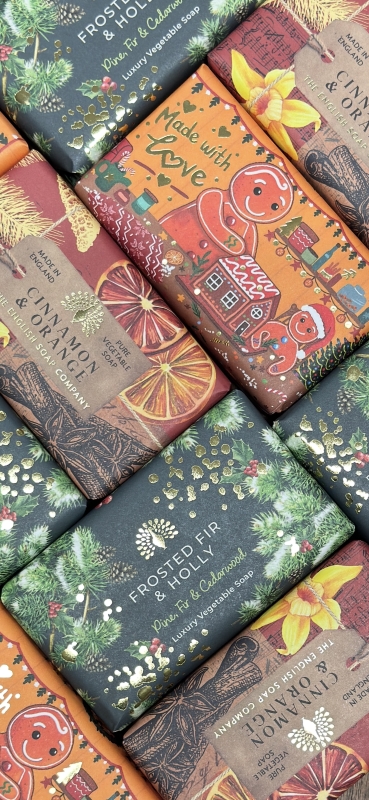 Beautiful paper wrapped soap bars, made from vegetable oils and enriched with moisturising shea butter. Fragrances and packaging inspired by the festive season.