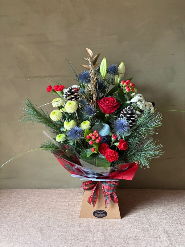 A festive arrangement full of rich reds, cool winter tones, and natural textures. Features crisp greenery, frosted accents, and bold seasonal highlights wrapped with a tartan bow. Tartan & Thistle brings a warm, traditional Scottish touch