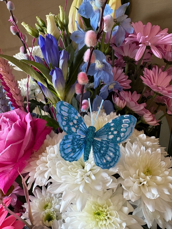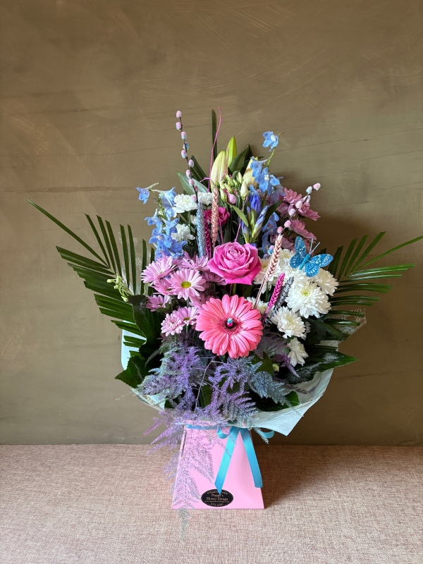 This charming arrangement blends uplifting pink tones with cool, refreshing blues and crisp whites, creating a soothing harmony of colour and texture.